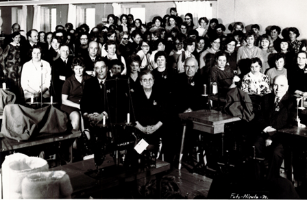 Teuvan Lakkitehtaan henkilökunta kuvattuna vuonna 1970 tehtaan 35-vuotisjuhlassa.